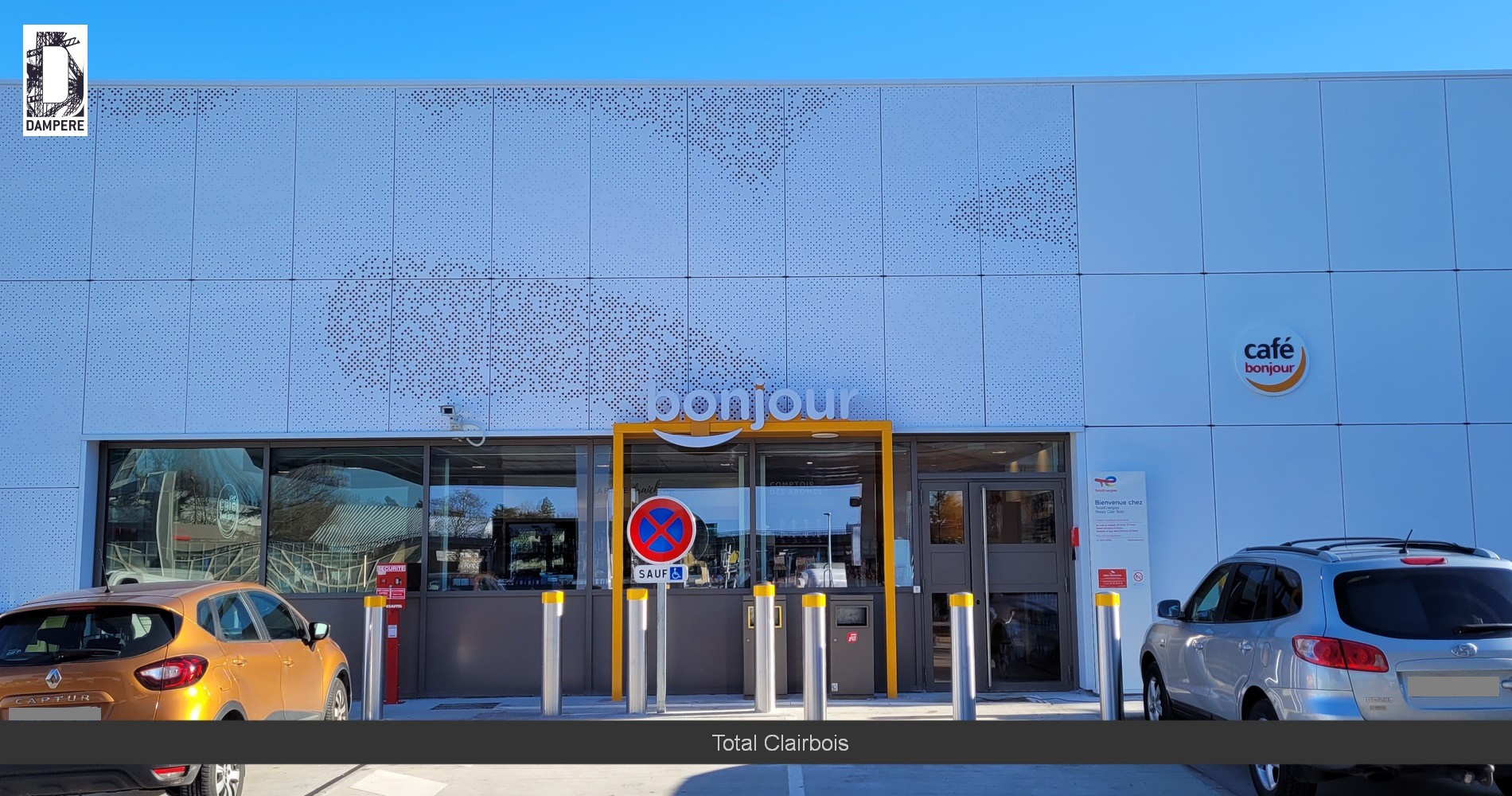 Les architectes de la façade de cette station essence Total au relais de Clairbois, voulaient un effet de tôle perforée décorative en forme de nuage sur base de perforations rondes sur toutes les façades en continuité du bâtiment de services et commerce.